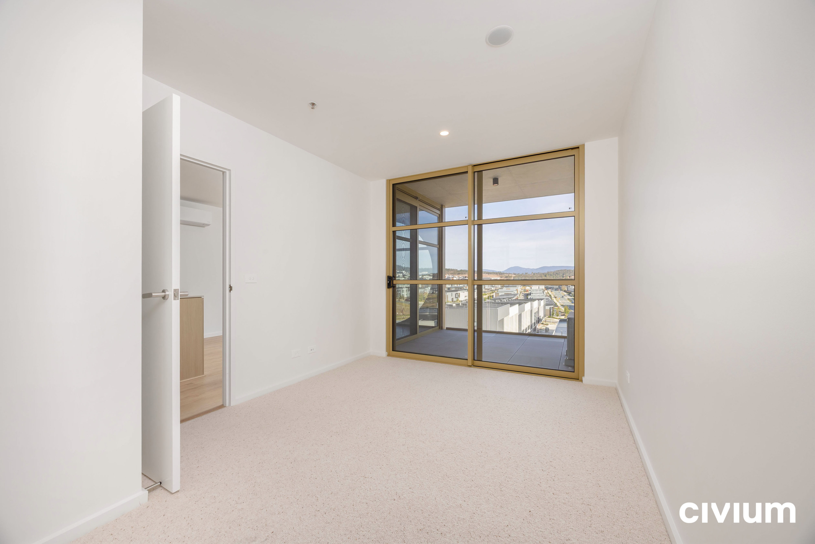 The open-plan kitchen, living and dining space is finished with timber floors, flowing out to a covered balcony that captures natural light and district views. The kitchen features Franke appliances, including an induction cooktop, sleek cabinetry, and a stone-topped breakfast bar perfect for casual dining or entertaining.