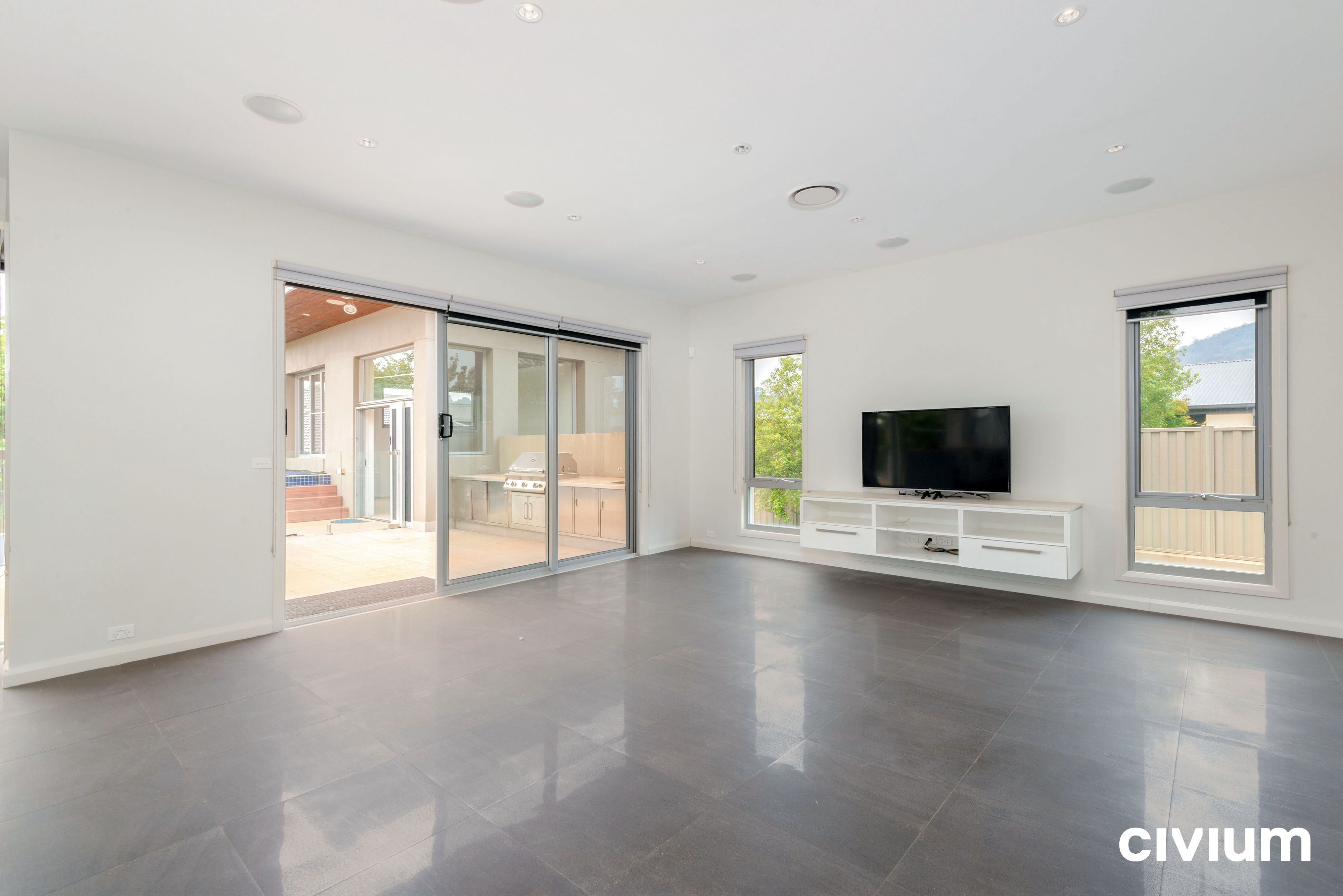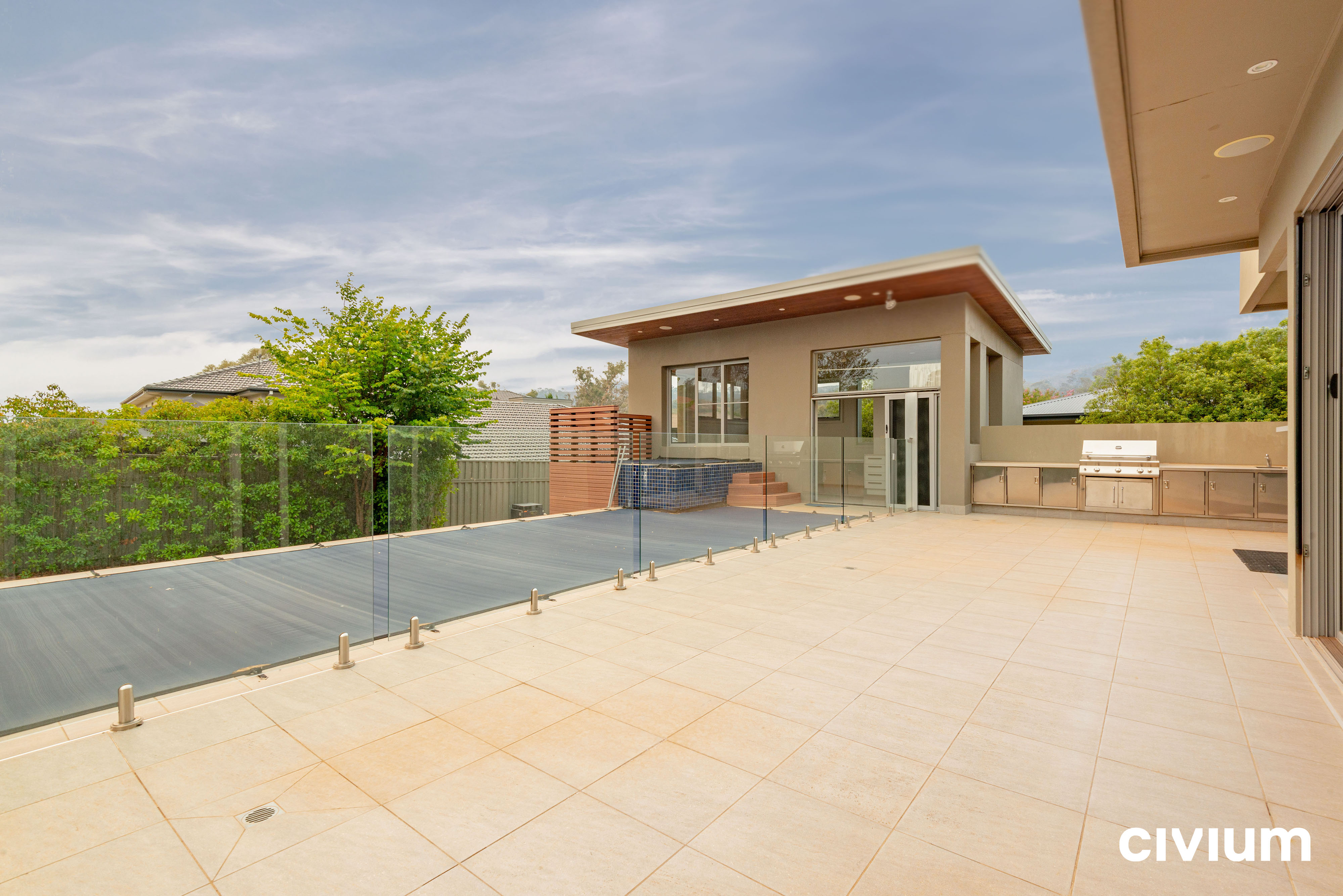 – Swimming pool, outdoor spa and pool room to the rear of the property