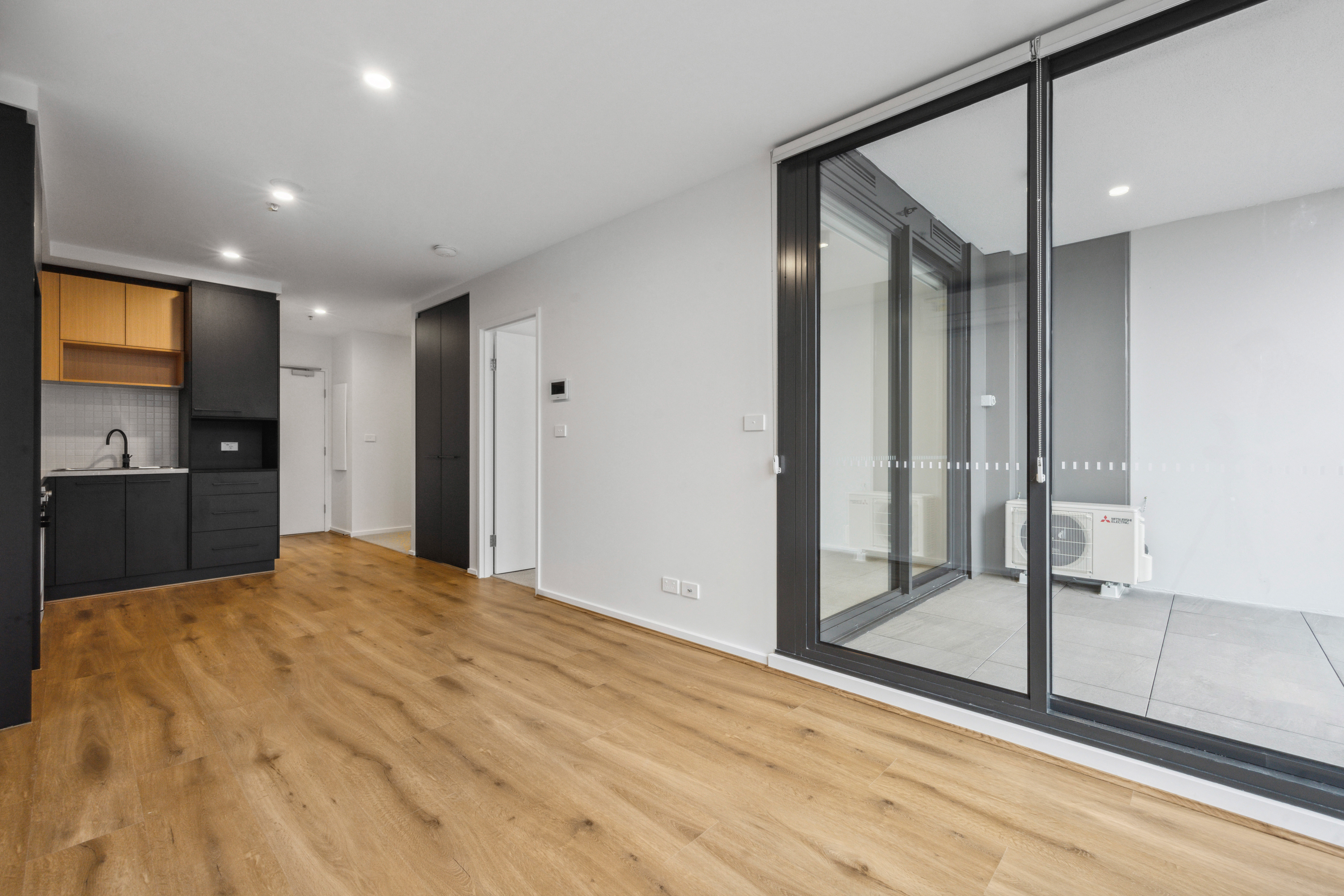Step inside to discover a generous open-plan living space flooded with natural light from double-glazed sliding doors that open onto a private balcony. The sleek, modern kitchen is fitted with quality appliances, while floorboards throughout the living areas add a touch of sophistication.